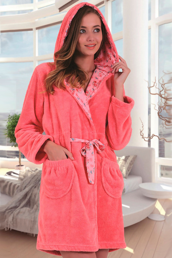 Халат жіночий махровий довгий рукав на запах з кораловим капюшоном. купити в Україні