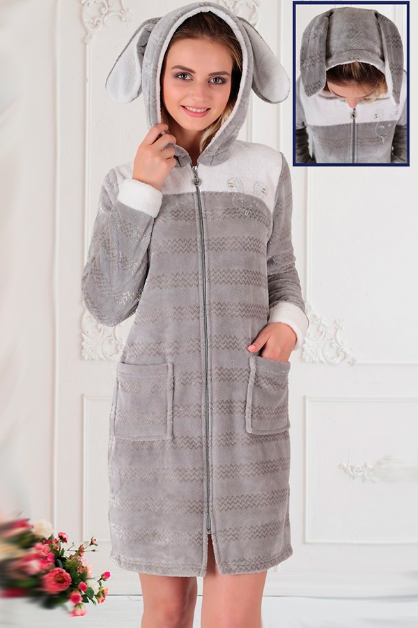 Халат жіночий махровий на блискавці довгий рукав з капюшоном та вушками купити в Україні