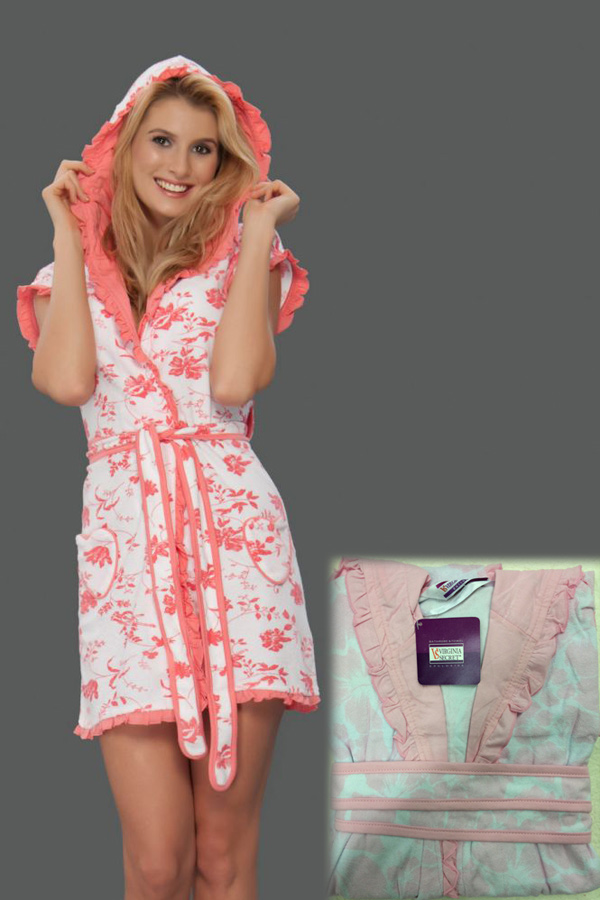 Халат жіночий махровий на запах з капюшоном короткий рожевий рукав купити в Україні