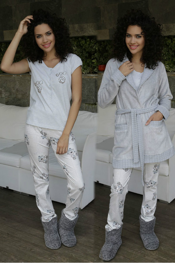 Комплект жіночий піжама брюки футболка короткий рукав халат на велюровий запах купити в Україні