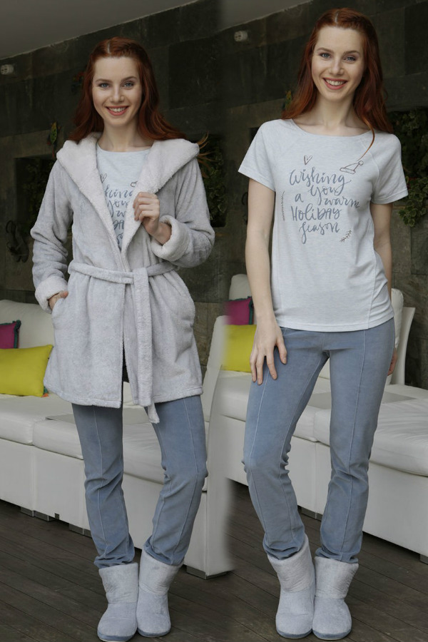 Комплект жіночий піжама штани футболка короткий рукав халат на запах з капюшоном софт купити в Україні