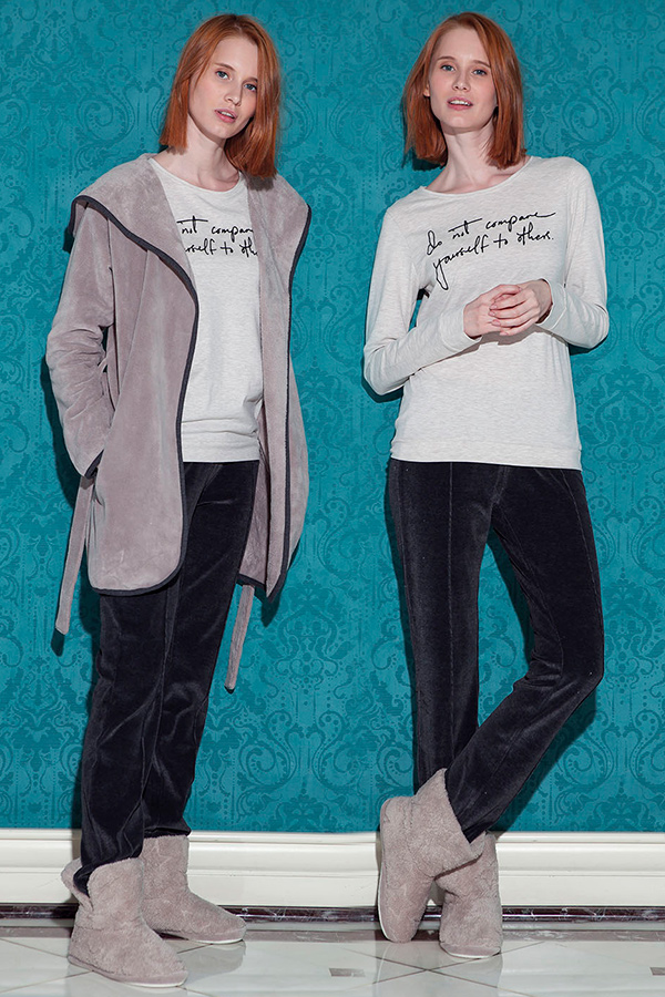 Комплект жіночий піжама велюрова брюки кофта довгий рукав і халат на запах з капюшоном софт купити в Україні