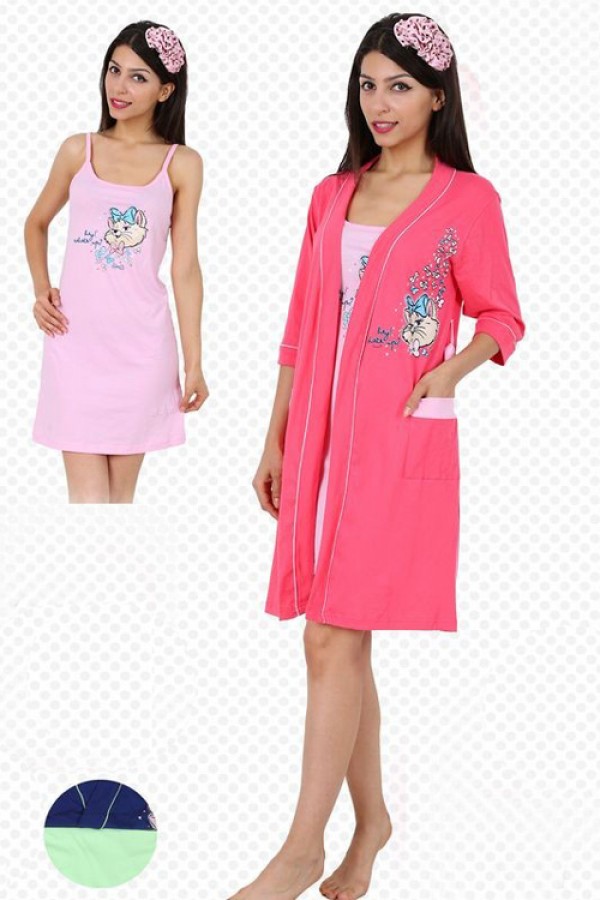 Набір жіночий нічна сорочка на бретелях халат на запах синій купити в Україні